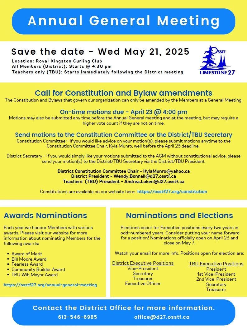 It is at the AGM that our annual Budget is set and changes can be made to our Constitution and Bylaws. Also, there are District and TBU Awards presented at the AGM. This year is also an Election year. More information coming soon!